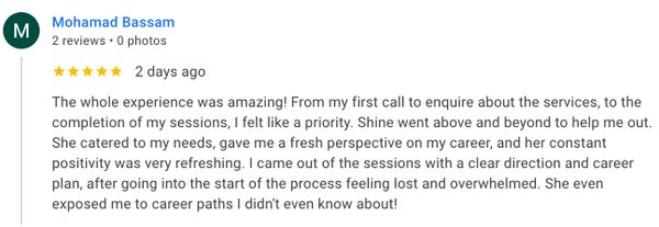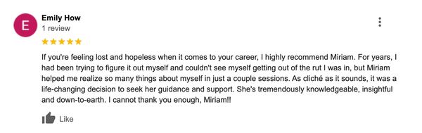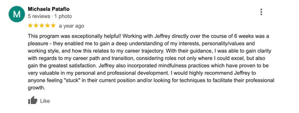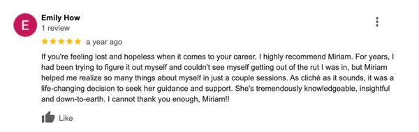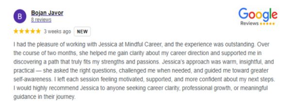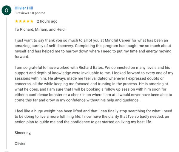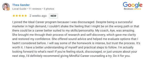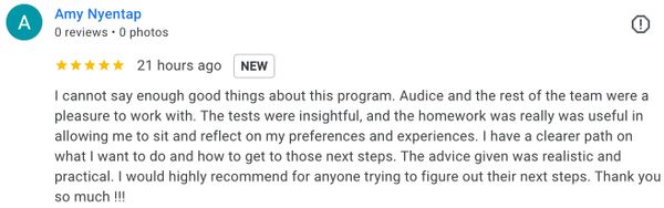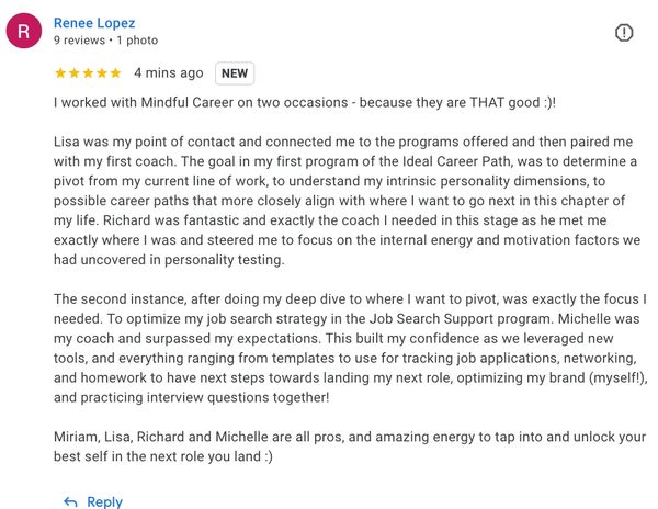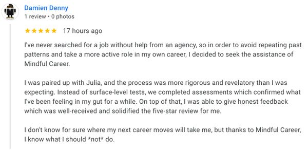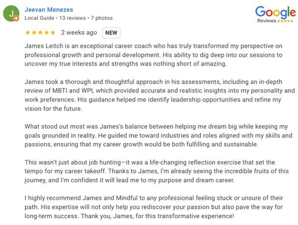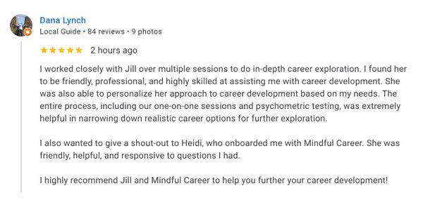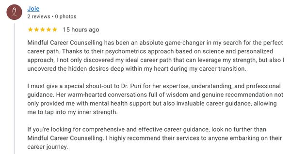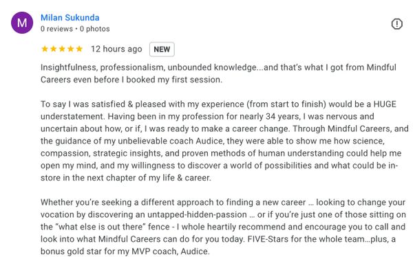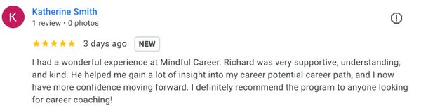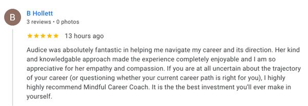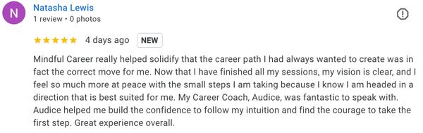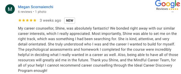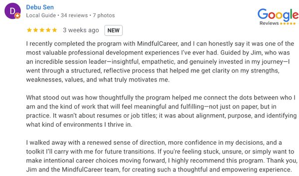 "Working with Mindful Career was one of the most transformative experiences of my professional life. I came in feeling stuck at a crossroads, ready to pivot but unsure how. Through the Ideal Career Guidance program, I uncoverED my true strengths, clarify my goals, and shift into a career that aligns with who I am. I’m now on a fulfilling path and I couldn't be more grateful!"
