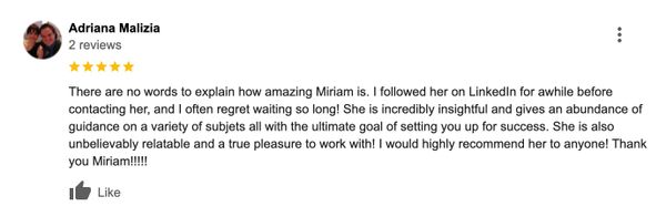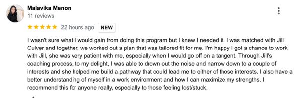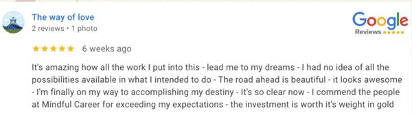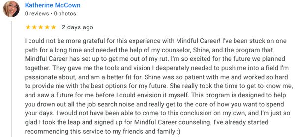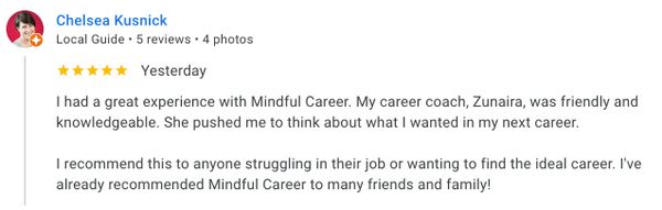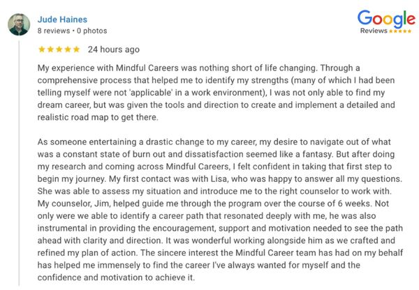 "My experience with Mindful Careers was nothing short of life changing. Through a comprehensive process that helped me to identify my strengths, I was not only able to find my dream career, but was given the tools and direction to create and implement a detailed and realistic road map to get there."