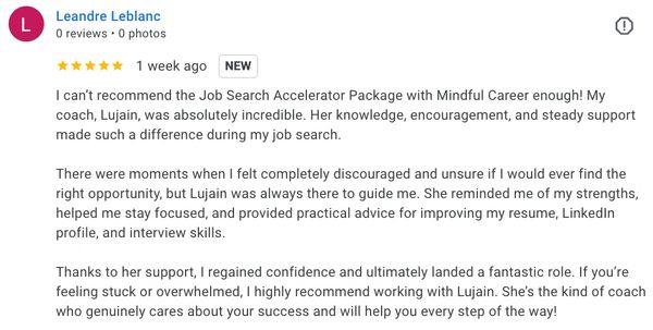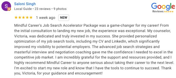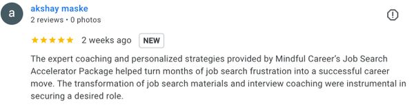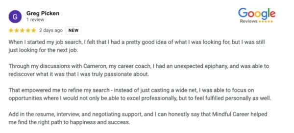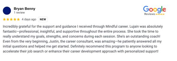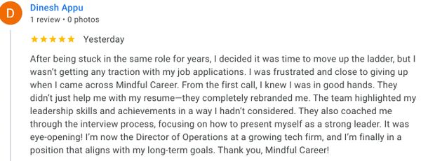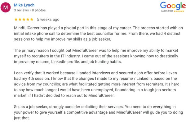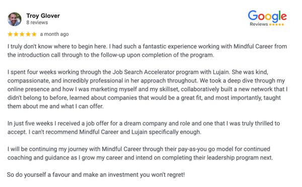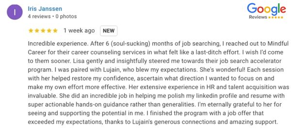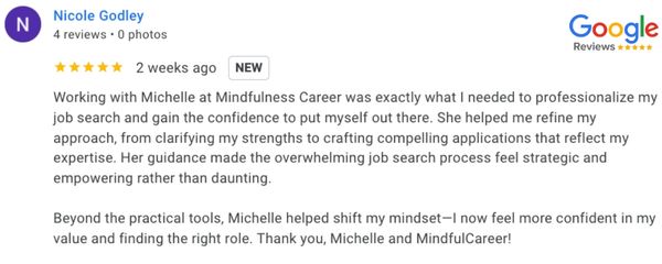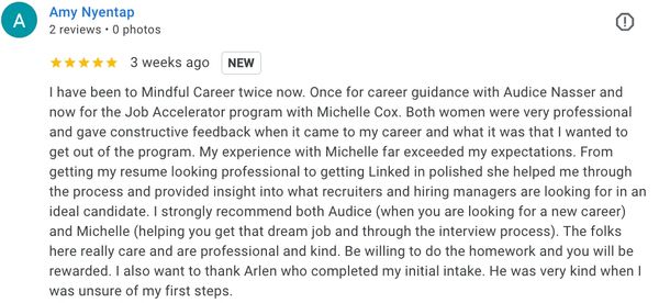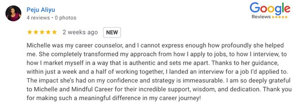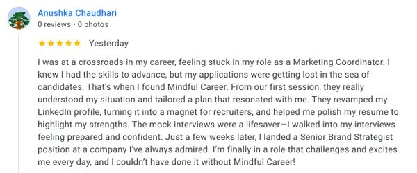 "I was applying for jobs I thought I was qualifies for, for months, with zero responses. After Mindful Career's 4 week Job search program I had 4 competing offers and am now a Legal Counsel making 3 times my original salary! "