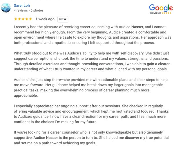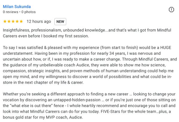 "I worked with Mindful Career on two occasions - because they are THAT good! The Ideal Career Path program helped me uncover my intrinsic personality dimensions and align with a career that fits where I want to go next. The next step, The Job Search Support program exceeded my expectations which helped me secure my dream job as a Learning and Development!"