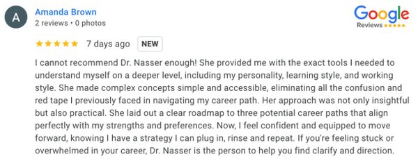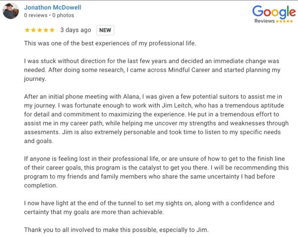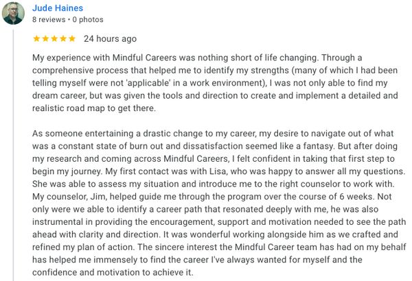 "My experience with Mindful Careers was nothing short of life changing. Through a comprehensive process that helped me to identify my strengths, I was not only able to find my dream career, but was given the tools and direction to create and implement a detailed and realistic road map to get there."