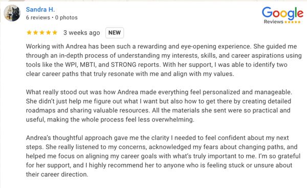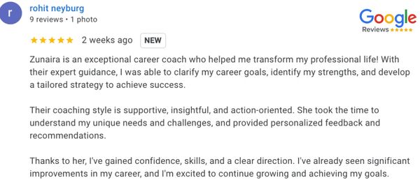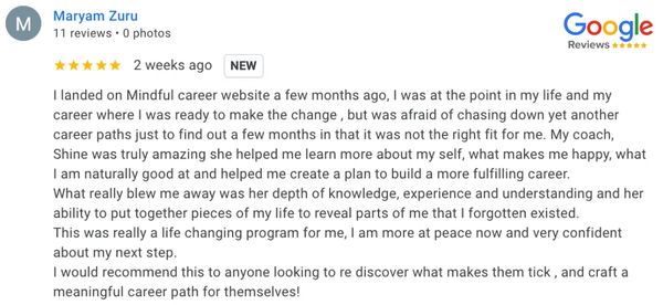 "Working with Mindful Career was one of the most transformative experiences of my professional life. I came in feeling stuck at a crossroads, ready to pivot but unsure how. Through the Ideal Career Guidance program, I uncoverED my true strengths, clarify my goals, and shift into a career that aligns with who I am. I’m now on a fulfilling path and I couldn't be more grateful!"