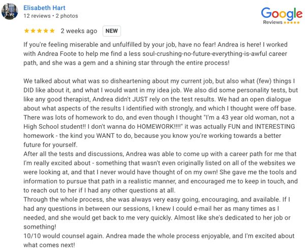 "My experience with Mindful Careers was nothing short of life changing. Through a comprehensive process that helped me to identify my strengths, I was not only able to find my dream career, but was given the tools and direction to create and implement a detailed and realistic road map to get there."